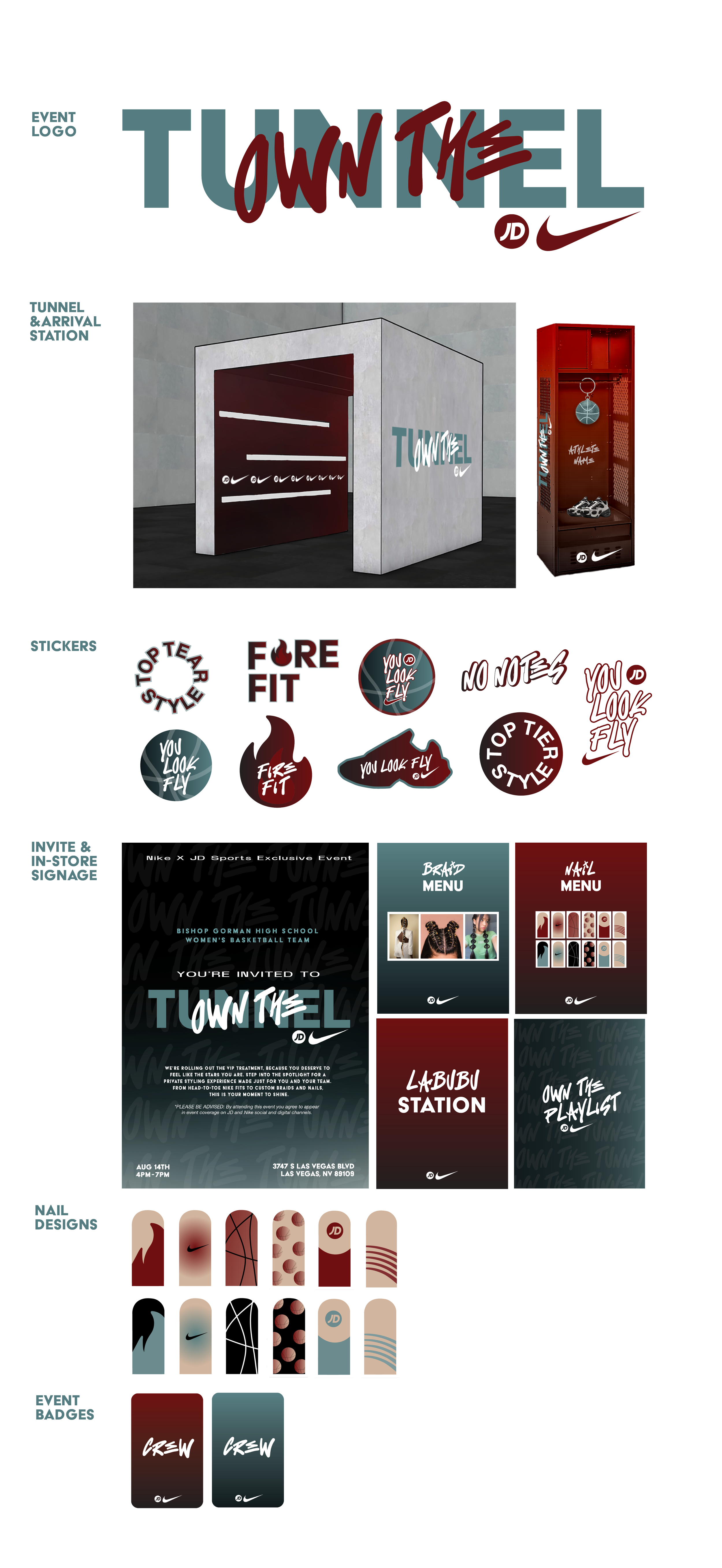 Nike and JD Sports hosted an exclusive event for a girls high school basketball team to celebrate the launch of the new Nike Air Max Muse. The experience gave them a taste of the pro athlete treatment, styled by a celebrity stylist, glammed up with custom nails and hair, and walking through a branded tunnel we designed just like the pros do.